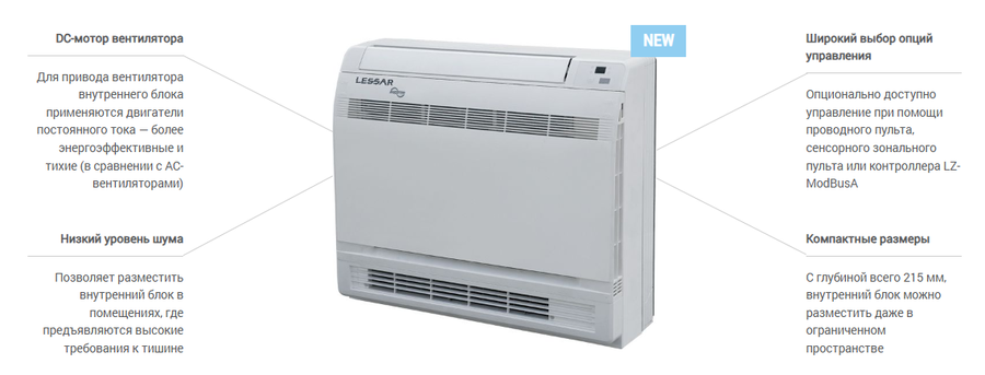 Lessar (Лессар) LSM-AH22OUA2 – это консольный внутренний блок для системы VRF. Эргономичная форма корпуса гарантирует удобный монтаж вертикально на полу или на стене. Для управления можно воспользоваться комплектным беспроводным пультом или дополнительно приобрести другой пульт или контроллер.